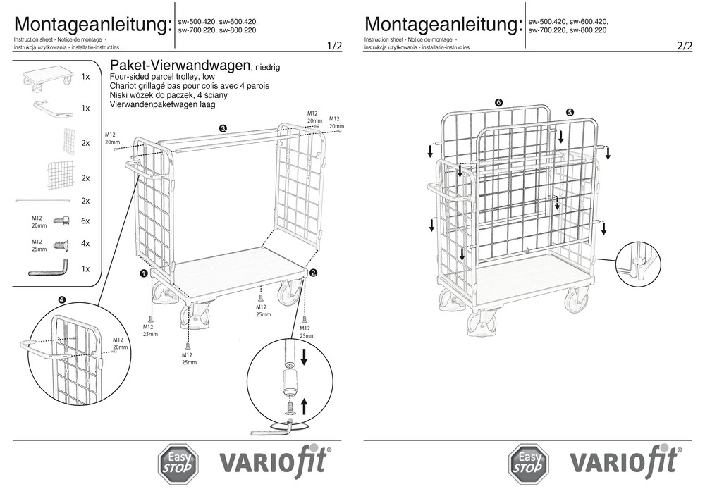 Gepäckwagen VARIOfit, hoch 1220 mm, 4-seitig, Ladefläche 1000x700 mm, Tragfähigkeit 500 kg