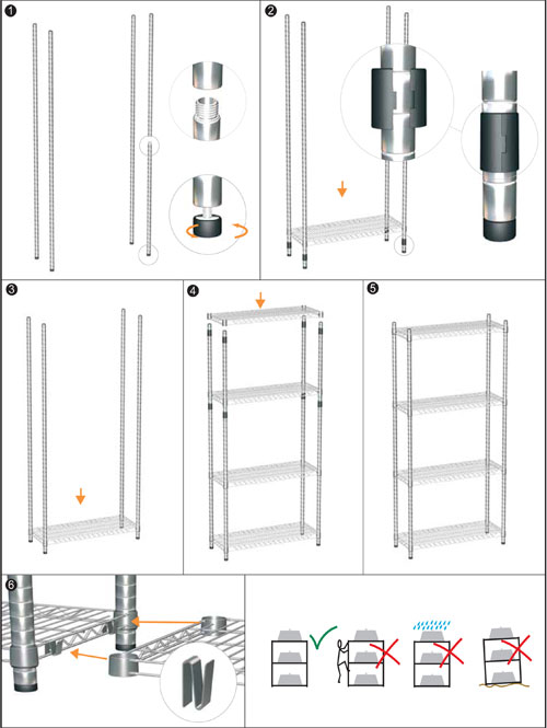 - Stahlrohrsäulen mit 25 mm Durchmesser und mit feinen Kerben im Abstand von jeweils 25 mm. Die Säulen sind oben mit einer verchromten Kappe versehen und unten mit einem Schaft und einer Ausgleichsschraube um Bodenunebenheiten von bis zu 20 mm auszugleichen. Der Schaft kann durch eine Laufrolle ersetzt werden und aus dem Regal wird somit ein Etagenwagen.