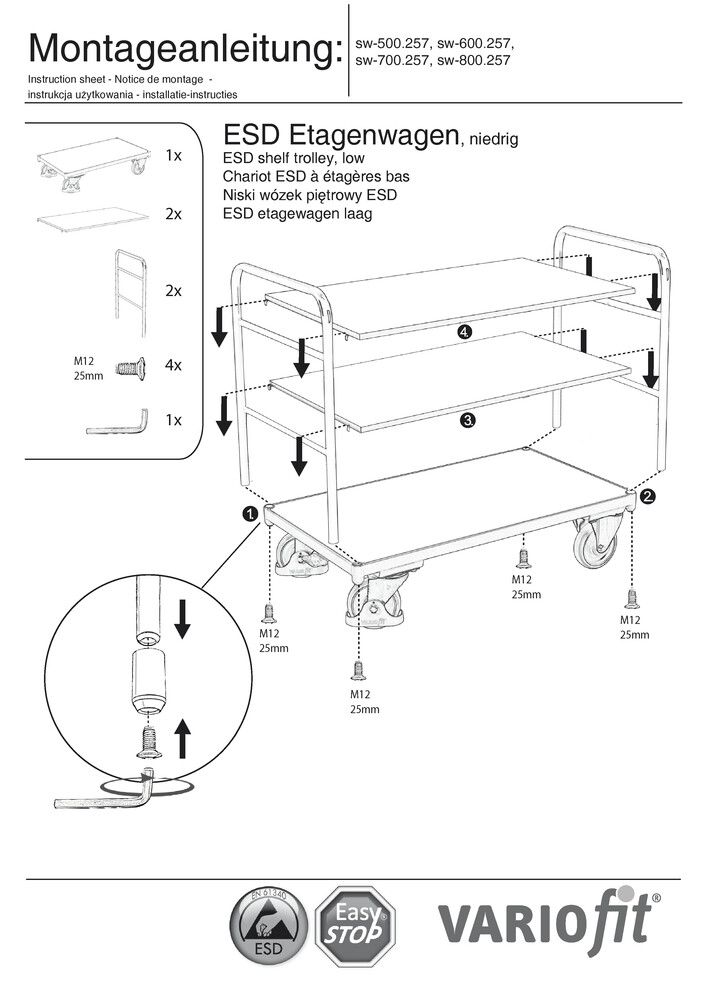 ESD - Etagenwagen VARIOfit, 3 Etagen, 1000 x 600 mm. Tragfähigkeit 250 kg