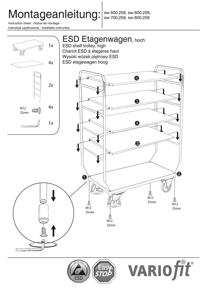 ESD - Etagenwagen VARIOfit, 5 Etagen, 850 x 500 mm, Höhe 1524 mm, Tragfähigkeit 250 kg
