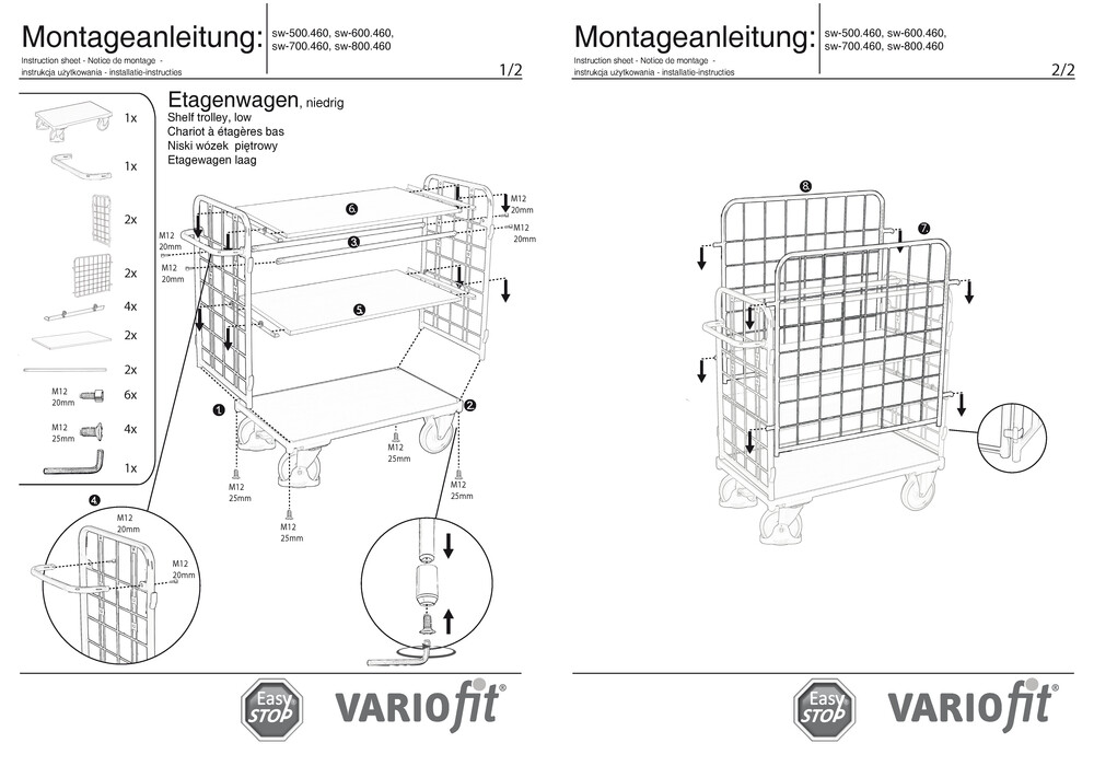 Etagenwagen VARIOfit mit 4 Hochwänden, Gesamthöhe 1220 mm, 3 Etagen 1200x800 mm, Tragfähigkeit 500 kg