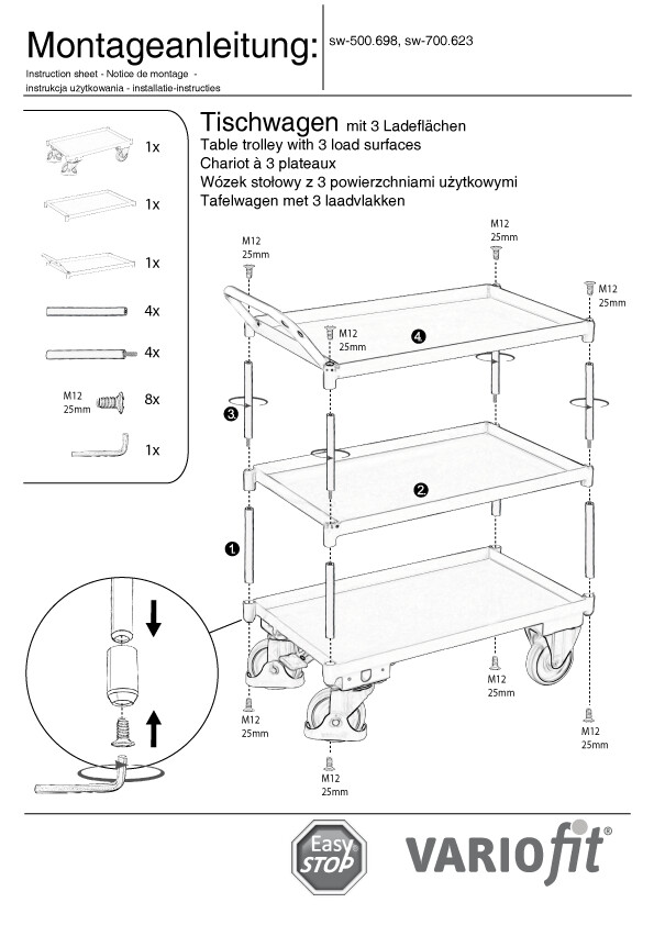 Montagehilfswagen VARIOfit mit 3 Wannenböden, Hochbügel, 845x495 mm, Tragfähigkeit 400 kg