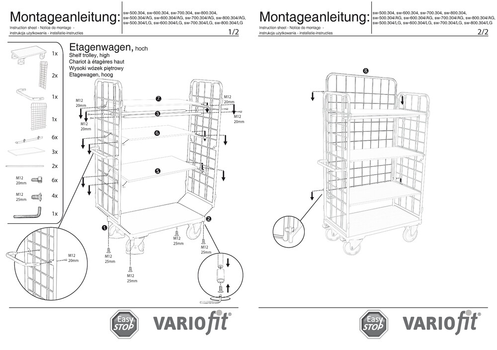 Etagenwagen VARIOfit mit 3 Hochwänden, Gesamthöhe 1780 mm, 4 Etagen 850x500 mm, Tragfähigkeit 400 kg, Farbe Lichtgrau RAL7035 /Platte Grau