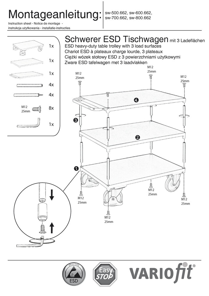 ESD - Tischwagen VARIOfit, 3 Etagen, 1000 x 700 mm. Tragfähigkeit 500 kg